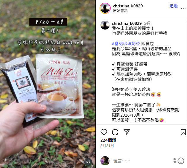 我們知道,山友們的背包空間有限,裝備重量斤斤計較,但幸福感不能省!這款基諾珍珠奶茶包 Q 彈黑糖珍珠+香濃奶茶的經典組合,超適合戶外運動愛好者!不僅真空包裝、免冷藏、加熱即飲還附贈吸管,從郊山一日行程到高山露營通通適用。